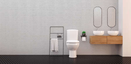 Minimalist toilets.Modern style design with black and white hexagon tile.3d rendering