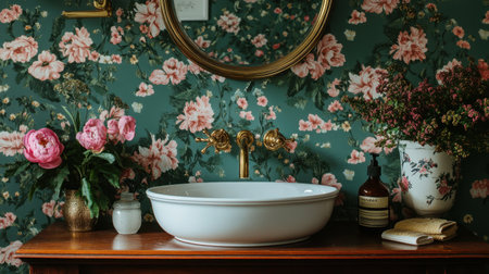 A beautifully styled bathroom scene featuring floral wallpaper, a vintage sink, and lush arrangements of peonies creating a tranquil and inviting atmosphere.