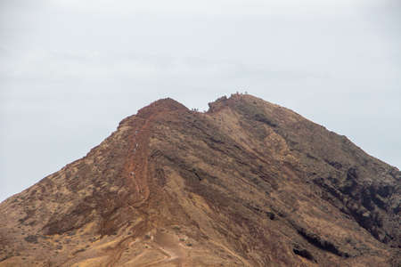 Stormy sea and rocks in the waves at ponta Sao lourenco at the edge of the island of madeira, Portugal. Very special landscape with volcanic brown and yellow stone. stormy weather and sea. Perfect concept for landscape traveling outdoor activities.
