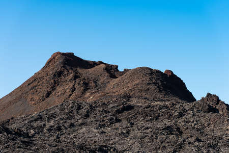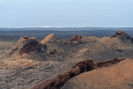 Unique panoramic view of spectacular lava river flows from a huge volcano crater, creates a lunar landscape on planet earth. Mountains of fire, Timanfaya National Park, Lanzarote, Canary Islands, Spain.