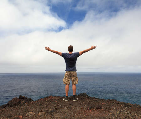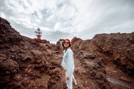 Carefree stylish woman enjoying trip on a rocky landscapes, walking on the desert pathway near a Teno lighthouse on the north-west of Tenerife island