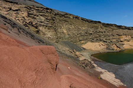 Green Lagoon, el Golfo on Lanzarote, the Canary Islands. Red, yellow and brown volcanic rocks with a green lake on the black beach.