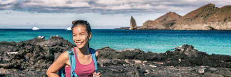 Panoramic banner of Galapagos tourist walking on Santiago Island in Galapagos Islands. Pinnacle Rock and Bartolome Island in background. Famous Galapagos cruise ship tour destination.