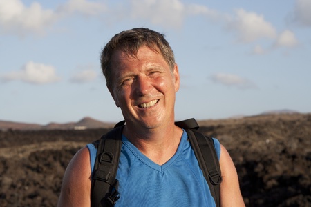 Views on black lava mountains during guided hiking discovery tour Termesana route in Timanfaya national park, Lanzarote, Canary, Spain.