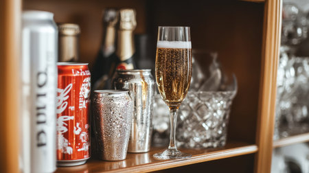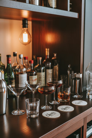 Home Bar Setup with Assorted Spirits and Cocktail Glasses
