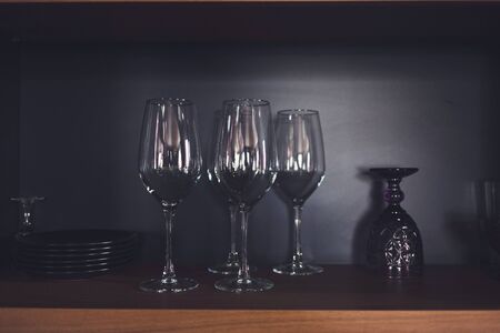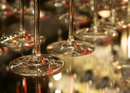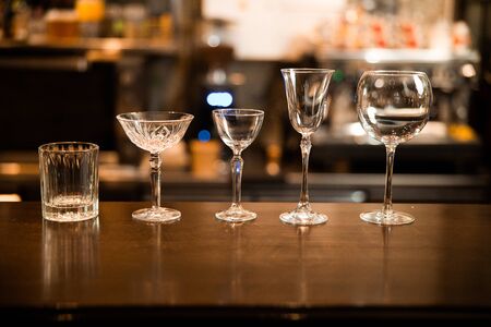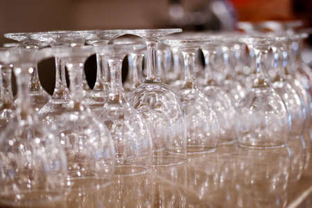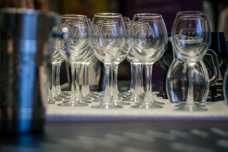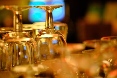 Many empty wine glasses on the bar counter. Wine glasses on blurred background