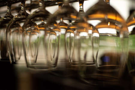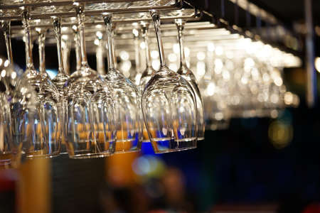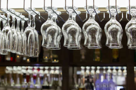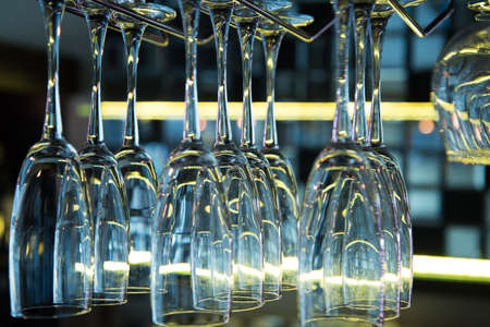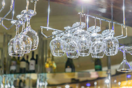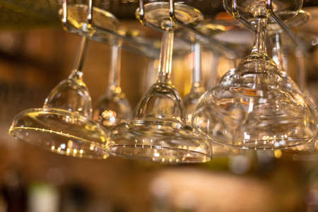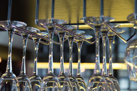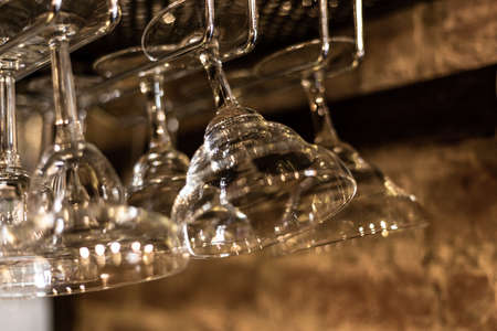 hanging glassware. Empty clean glass for vine and champagne at the bar. Selective focus