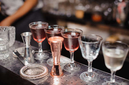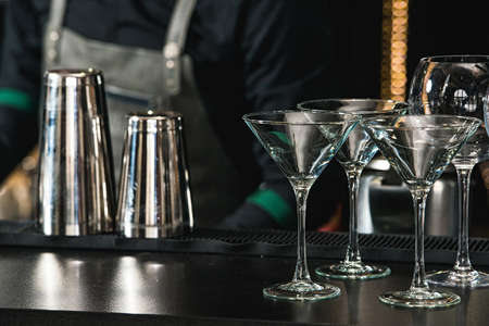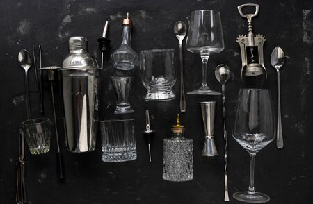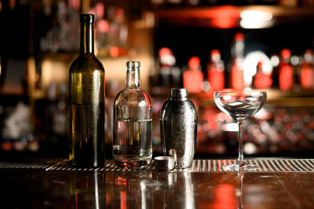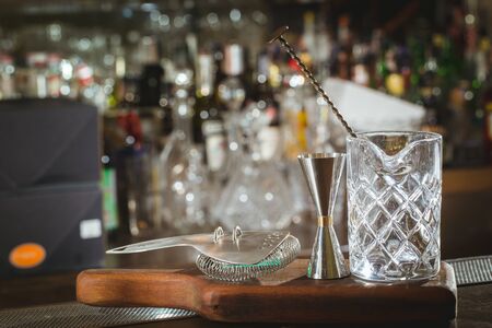 Set of essential barman equipment on the bar counter on the blurred background of the bar