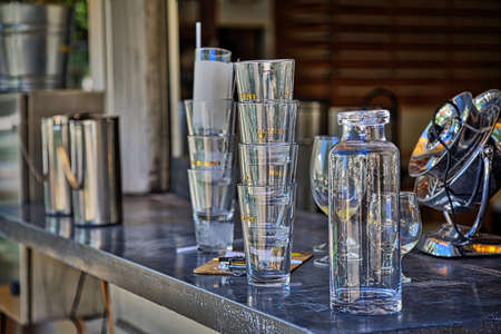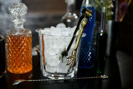 Washed professional bar equipment and a glass filled with ice arranged on the bar counter