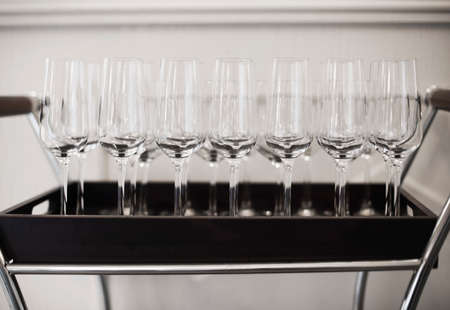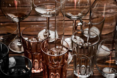 Various empty glasses on the table with blurred luxury interior, selective focus