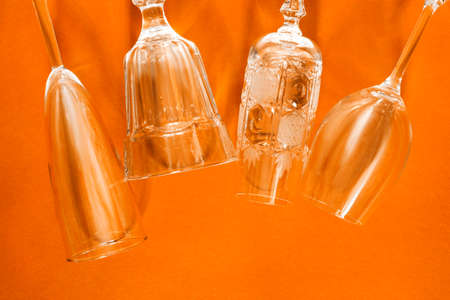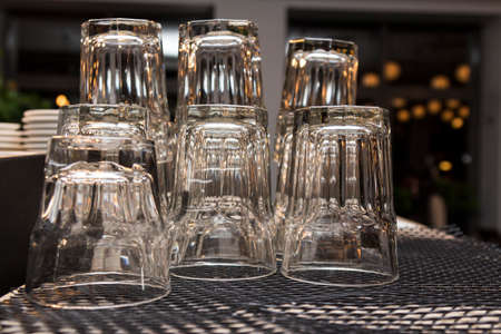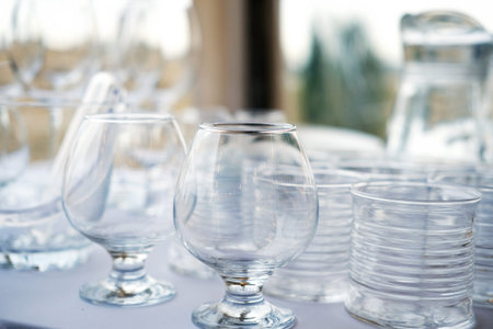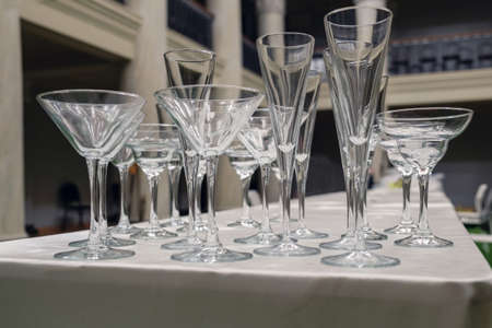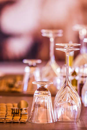 Empty glasses set in restaurant, empty wine glasses on the table different type