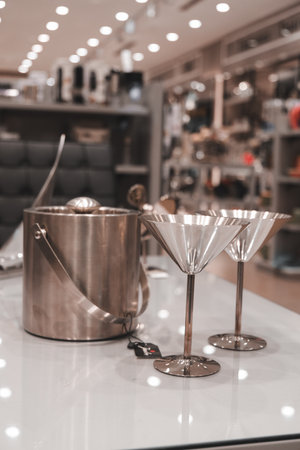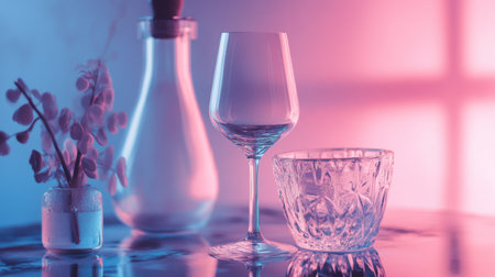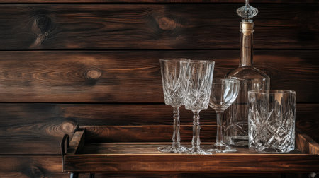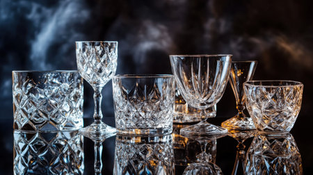 A stunning arrangement of elegant glassware on an ornate tray, capturing reflections with soft ambient lighting, perfect for a sophisticated dining atmosphere.