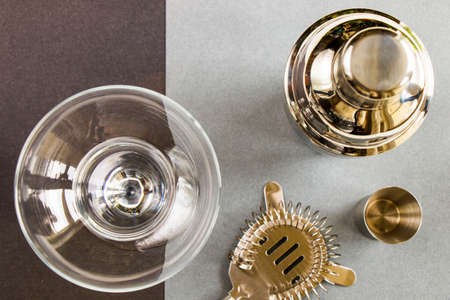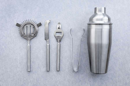 Various cocktail utensil set. Shaker, strainer, juicer. Top view flat lay with copy space