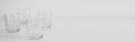Collection of clear glassware including stemmed glasses and tumblers arranged on a table, highlighting transparency and reflections in a well-lit environment