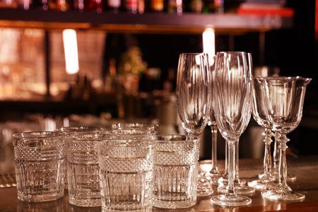 Empty wine glasses on a bar counter in a restaurant, close-up