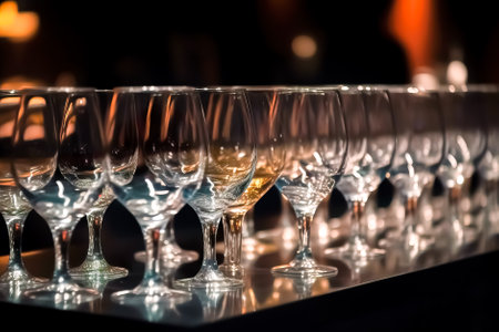 Wine glasses on a bar counter in a restaurant. selective focus. Generative AI.
