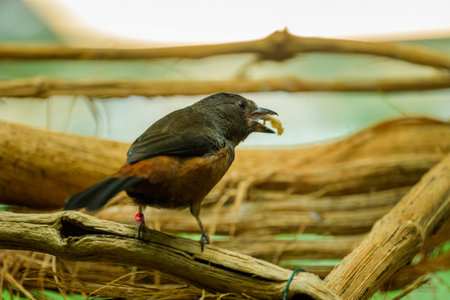 A female Brazilian tanager standing on the ground, eating