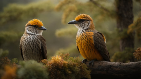 Pair of birds sitting on a branch in the forest. Wildlife scene from nature.