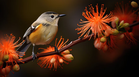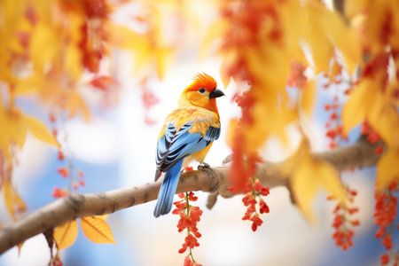 Colorful exotic bird with vibrant red, orange, and yellow feathers perched on a branch in its natural habitat. Striking plumage and captivating detail.