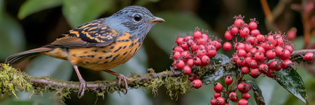 Vivid Orange Breasted Bird Perched on a Branch, Eyeing Delicious Wild Berries in Nature s Paradise