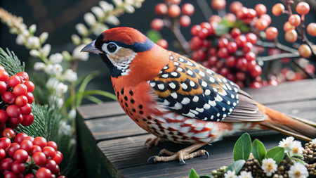 A colorful bird with red, white, and black feathers sits on a wooden surface surrounded by red berries and green leaves.