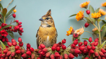 A small brown and white bird with a crested head sits amidst a wreath of red berries and yellow flowers against a light blue background.
