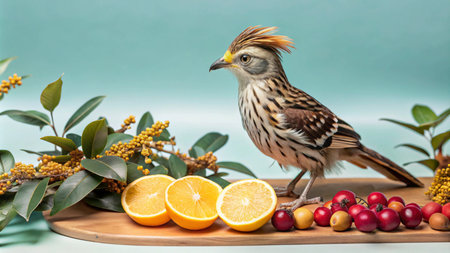 A small, brown and yellow bird with a feathered crest stands on a wooden board with oranges and red berries.
