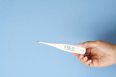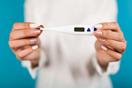 Female hands holding a digital thermometer. Girl measures the temperature.