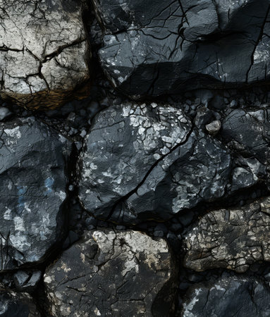 This image showcases a detailed texture of cracked dark rocks in a natural formation. The interplay of shadows and highlights creates a captivating visual suitable for geological themes.