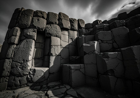 Ancient stone fortress wall constructed from immense, dark, rugged basalt columns, dramatically lit in monochrome. the monumental structure features steps and a doorway under a cloudy sky.