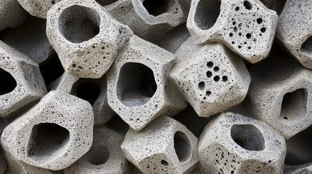 Close-up view of unique grey volcanic rocks featuring natural holes and cavities. Ideal for nature-themed projects, textures, and abstract designs.
