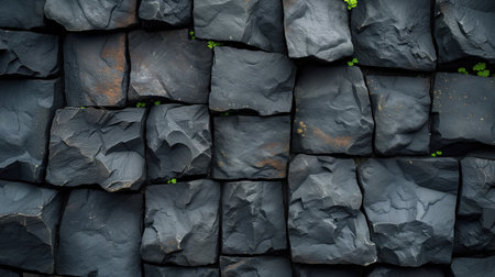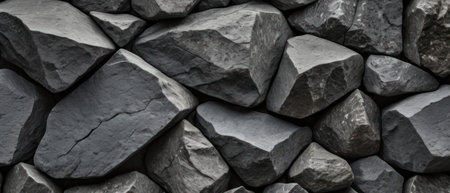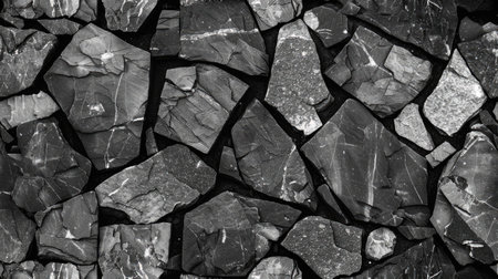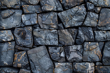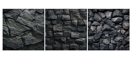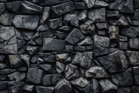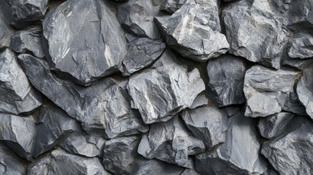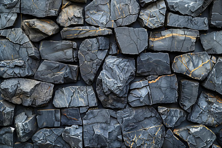 A variety of jagged black stones form a textured wall, showing natural patterns and shapes. The dark colors and uneven surfaces create a striking visual effect, suitable for numerous design and artistic applications.