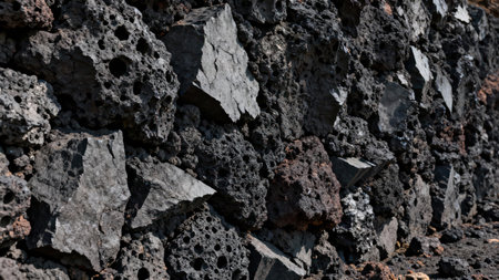 Highly porous angular black volcanic scoria and dark gray basalt stone blocks forming a rugged wall surface, strongly illuminated creating deep shadows and high contrast texture.