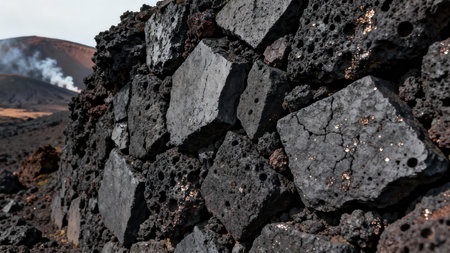 Protective barrier made of dark gray porous igneous rock blocks displaying golden pyrite flecks and deep cracks, contrasted against a distant steam-emitting volcanic cinder hill.