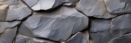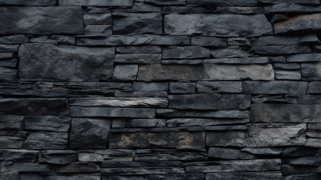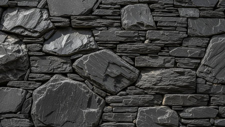 A detailed close-up of a dark gray slate stone wall, showcasing irregularly shaped rocks and layered stone slabs...