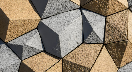 A close-up view of a wall featuring a geometric pattern composed of variously sized stone tiles in shades of brown, gray, and tan, with textured surfaces and sharp shadows.