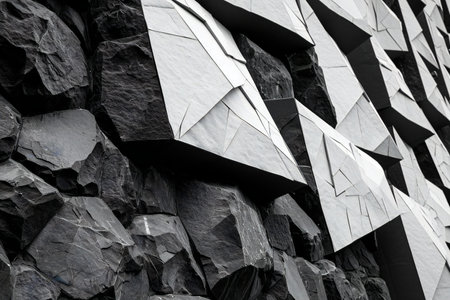 An abstract dark textured wall featuring geometric blocks that create a striking visual with contrasting shadows and depth, ideal for modern design themes.