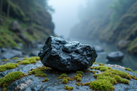 Shiny black rock on moss-covered stone in misty forest creek. That the image is generated using AI.