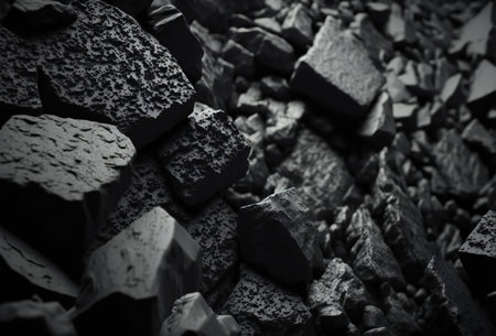 A close-up view of anthracite coal pieces, rough black texture visible, used to power the classic steam locomotives on Mount Snowdon, Wales