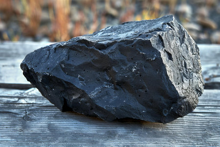 A close-up of a dark coal rock fragment on a rocky surface, illuminated by sunlight on one edge.
