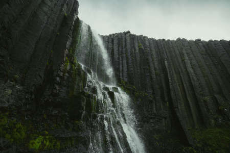 Scenic view of basalt column formation by Litlanesfoss waterfall in valley