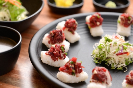 Beef heart stabbing Salt with wasabi and Ginger soy sauce on platter