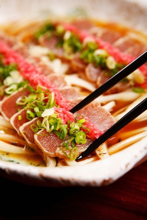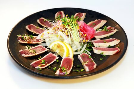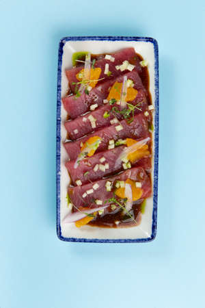 Popular Japanese dish Tataki from tuna with an appetizing ponzu sauce