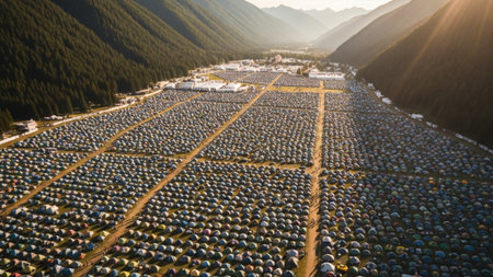 An ultrawide, panoramic aerial photograph capturing the immense scale of a sprawling temporary city