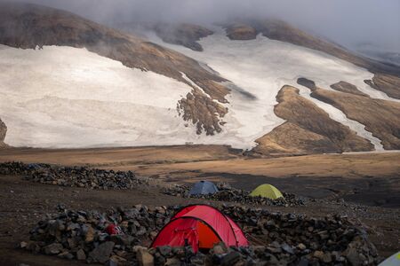 Camping with tents. Snowy mountain glaciers and storm wind. Iceland.