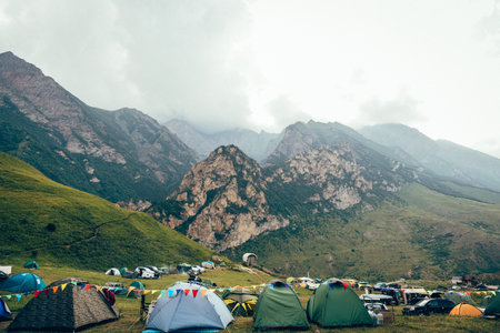 Camping in the mountains in the summer on a cloudy day.