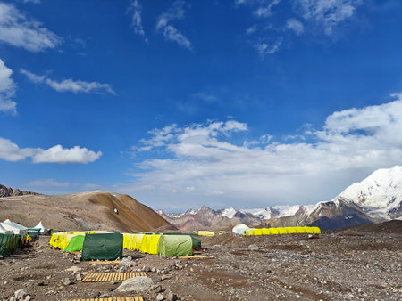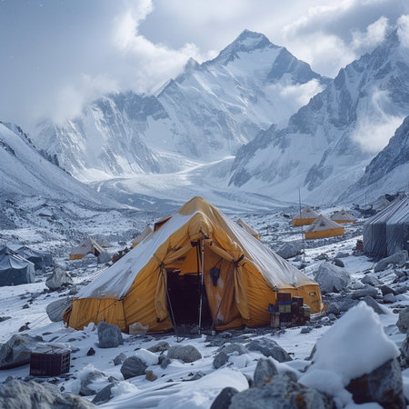 Vibrant Base Camp: A colorful array of tents sprawls across the rocky terrain, nestled beneath the towering mountain.