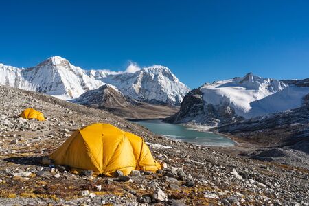 Yellow tents at Amphulapcha base camp surrounded by Himalaya mountains range in Everest region, Nepal, Asia