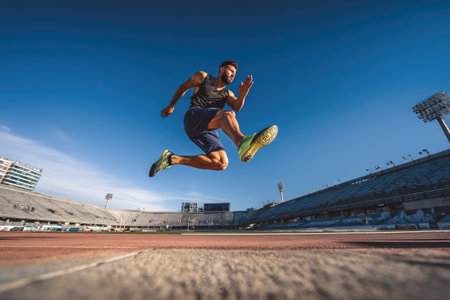 An athletic man is captured mid-jump, set against a vivid blue sky. The image showcases the runner in action with a low angle perspective, emphasizing the dynamic movement. The color palette incorporates greens, blues, and browns suggesting an outdoor setting. Suitable for various commercial and editorial applications.