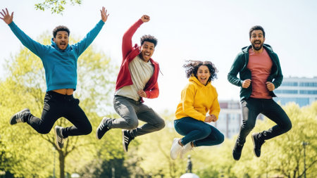 A group of individuals are captured mid-air, expressing excitement. They are dressed in casual attire, showcasing a mix of colors against a background of greenery and daylight. The composition utilizes a wide angle, capturing the dynamic energy of the subjects, ideal for use in various commercial projects.
